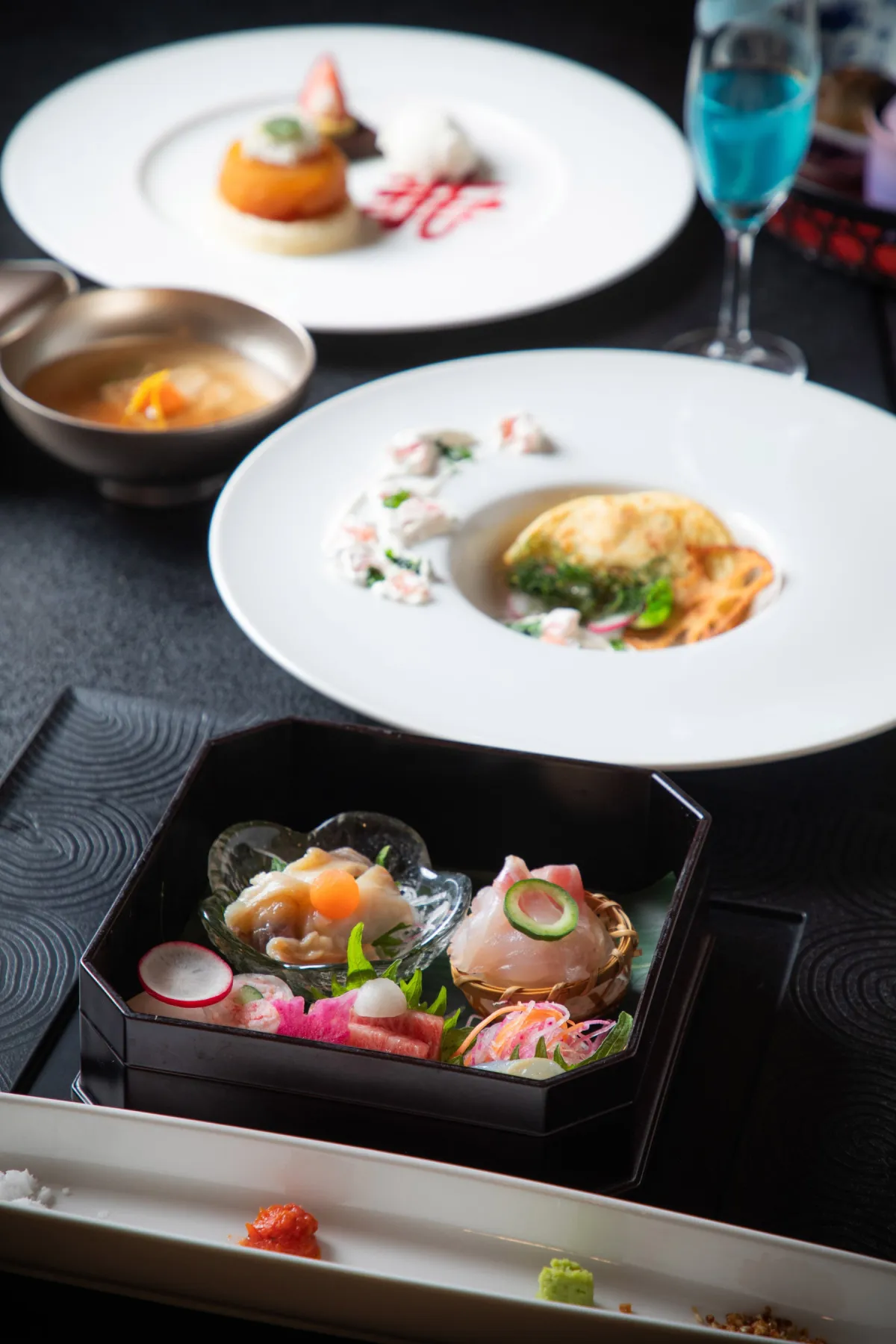 特別な先椀には、函館産の塩〆寒ブリを使用。「みぞれ椀」のスタイルで、大根とニンジンのとろみが絶妙なバランスで融合。お造りのコーナーでは、新鮮なホッキ、活〆ソイ、真ダラといった魚介類がそれぞれの調味料とともに並び、地元の海の恵みを十分に味わえます。