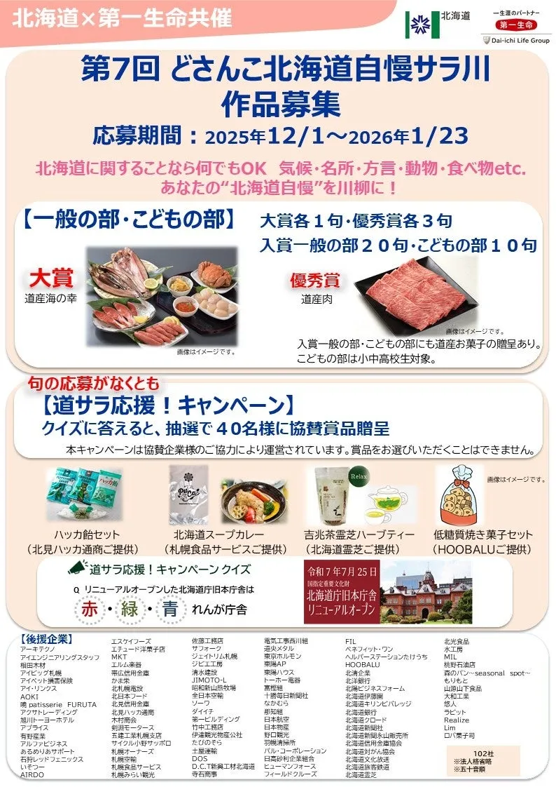 北海道と第一生命保険株式会社が共催する「第7回どさんこ北海道自慢サラ川」が始まりました!この川柳コンクールは、北海道にちなんだユニークな作品を募集しており、皆さんが自慢したい北海道の魅力を川柳で表現するチャンスです。