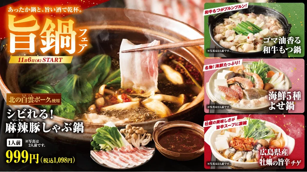 全国で238店舗を展開する海鮮居酒屋「はなの舞」と「さかなや道場」を運営するチムニー株式会社が、11月6日より「旨鍋フェア」を開催しています。このフェアでは、料理家の栗原心平さんが監修を手がけた冬の特別メニューや定番鍋が一堂に揃い、心温まる冬のひとときを提供します。