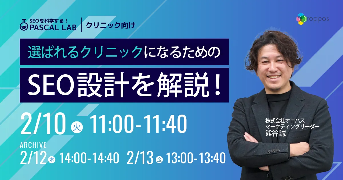 株式会社オロパスが主催する特別なウェビナーが、2026年2月10日(火)にオンラインで開催されます。このウェビナーでは、「選ばれるクリニックになるためのSEO設計」をテーマに掲げ、集患のための具体的な戦略を解説します。