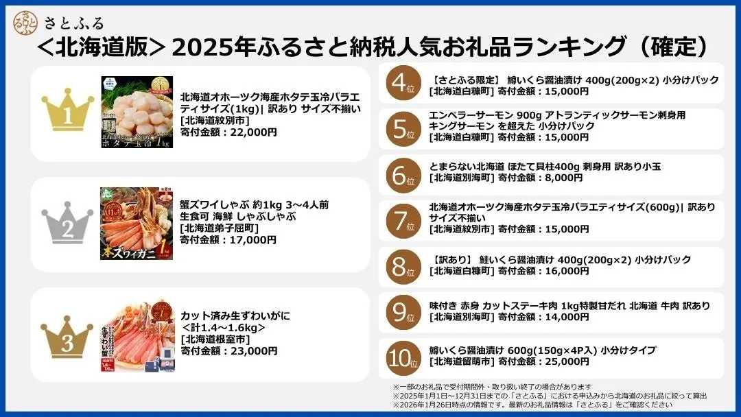 ふるさと納税ポータルサイト「さとふる」を運営する株式会社さとふるが、2025年における北海道版人気お礼品ランキングを発表しました。昨年からの流れを引き継ぎ、今回は特に海の幸が高い支持を受けています。