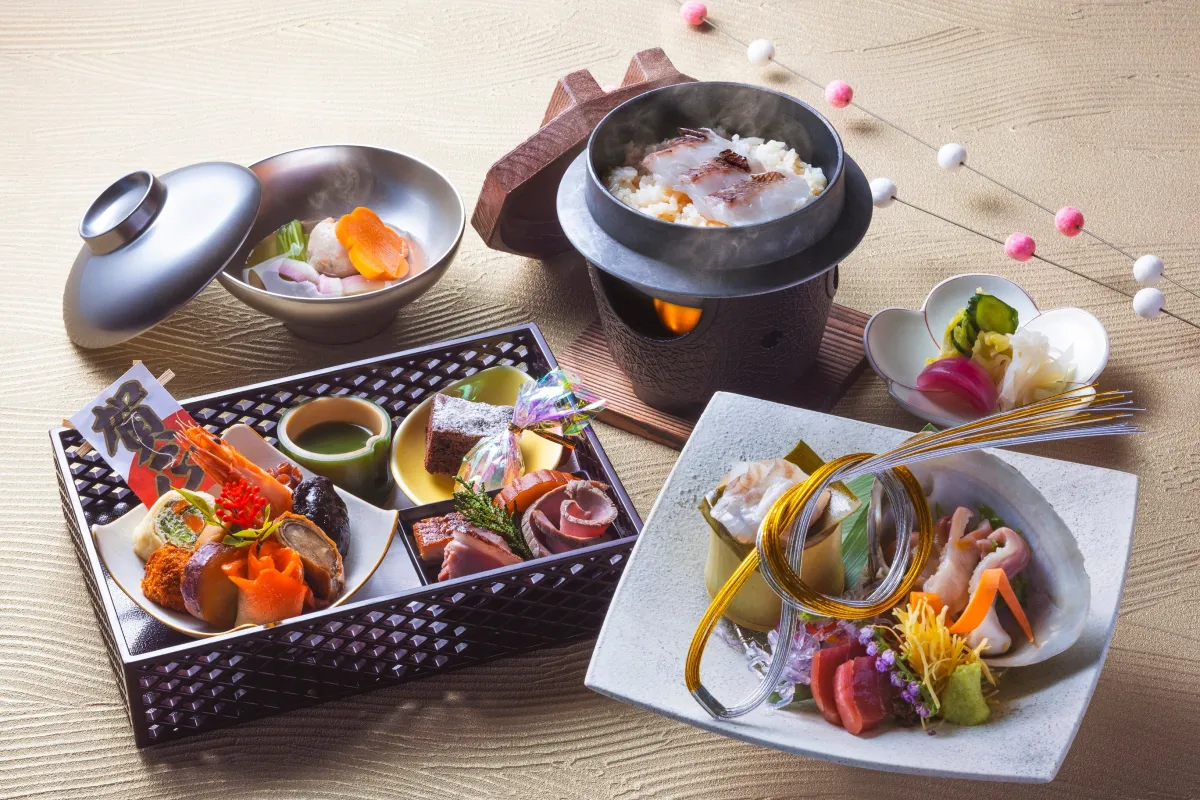 セットメニューにはおせち料理の他に、お造り、鯛釜めし、吸い物、香の物が含まれ、小学生までのお子様にもご用意があります。大人向けにはアレンジされた料理が提供されるので、家族みんなで楽しむことができます。おせちを味わいながら、新年の幸運を願うひとときをお楽しみください。