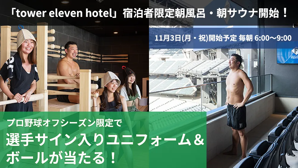エスコンフィールドHOKKAIDOで特別な朝を迎えられる宿泊施設「tower eleven hotel」が、2023年11月3日(月・祝)から、宿泊者限定で朝風呂と朝サウナを提供開始します。ここでは、球場の美しい景色と共に穏やかな朝を楽しめる特別な体験が待っています。