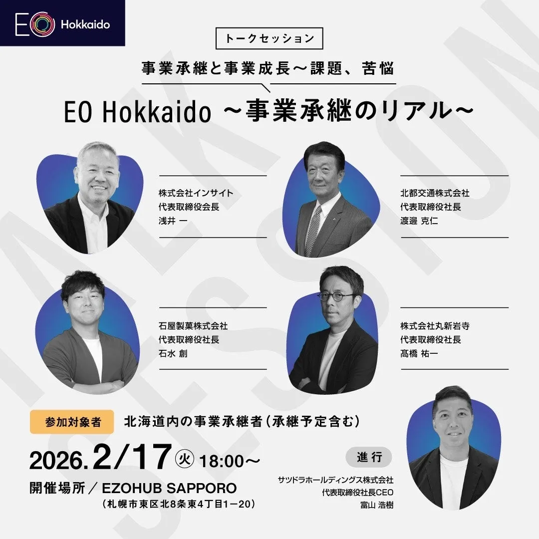 2026年2月17日、札幌市のEZOHUB SAPPOROにおいて、事業承継に関するトークセッション「事業承継のリアル」が開催されます。このイベントは、北海道内の経営者や承継予定者を主な対象としており、18:00から21:30までの間、実際に事業承継に取り組んできた方々の体験談を通して、事業承継の現実的な課題や成功の秘訣を探る場となります。