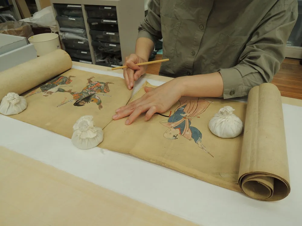 - - 蝦夷国風図絵(巻子装)修理の紹介: 展示の中には、巻子の修理過程を間近で見ることができるコーナーも。