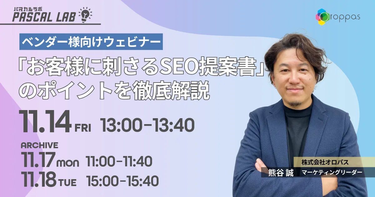 価格やサービスを提示するだけでは顧客の心は掴めません。適切なSEOの知識が求められる昨今、正確な提案書をスピーディに作成する技術が必要とされています。そこで、株式会社オロパスが提供するSEOツール『パスカル』を利用した無料ウェビナー「PASCAL LAB」が登場します。このウェビナーでは、特にベンダー向けに最適化されたSEO提案書の作成方法について詳しく解説します。