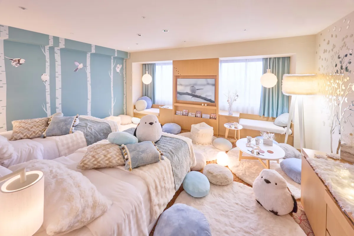 シマエナガルームの最大の魅力は、シマエナガに囲まれた優しい空間です。この部屋では、壁面が冬のシマエナガをイメージしたホワイト&ブルーのカラーで彩られ、北海道の美しい自然が感じられるイメージアートが施されています。また、靴を脱いで過ごせるリラックスしたスタイルで、旅先にいながらもまるで自宅にいるかのように心地よく過ごせる空間を提供します。
