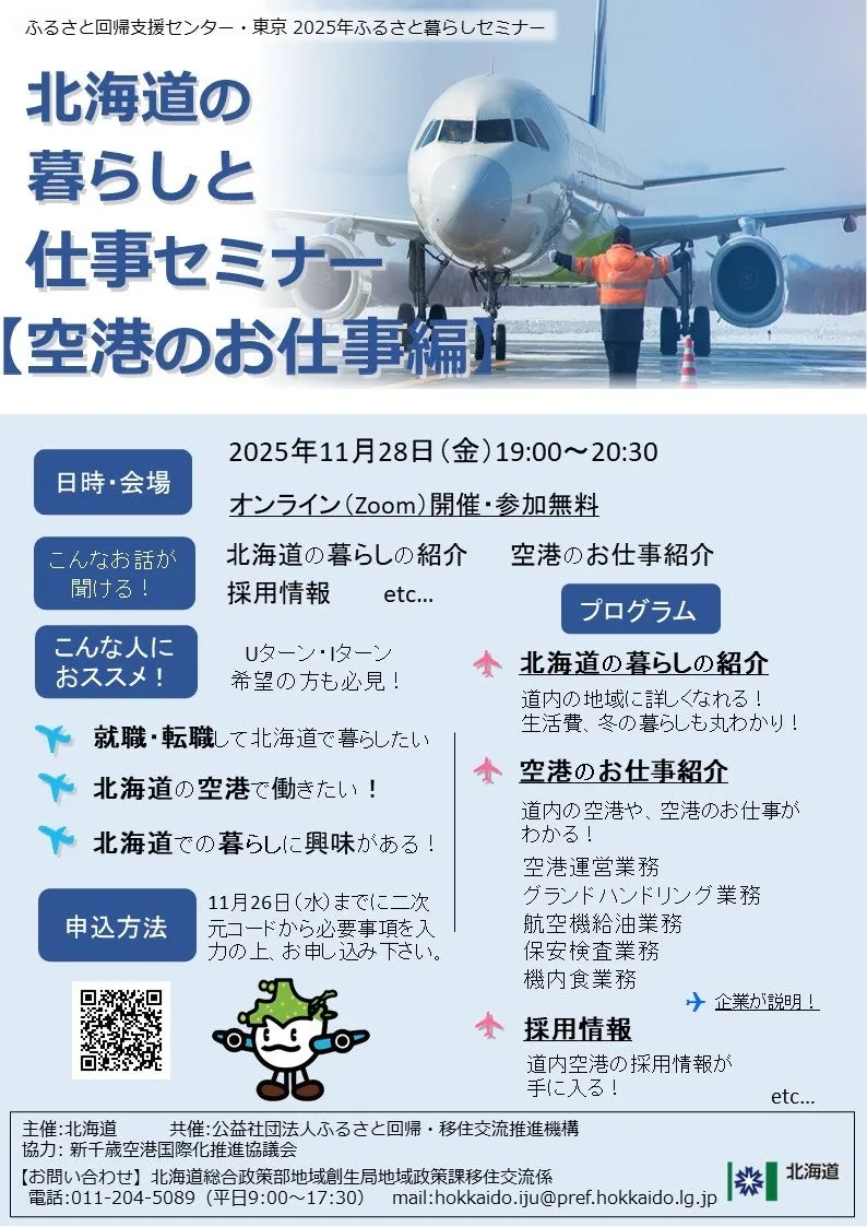 北海道では、一般社団法人北海道移住交流促進協議会を中心に、地域の魅力を発信しながら移住や定住の促進に取り組んでいます。このたび、移住に関心のある方々を対象にした「北海道の暮らしと仕事セミナー」の第3回が、11月28日(金)に開催されることが決まりました。今回のテーマは、航空業界に焦点を当て、特に空港の地上支援業務について詳しく知っていただく内容となっています。