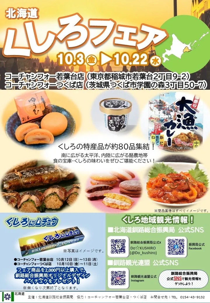 2025年10月3日から22日まで、東京都のコーチャンフォー若葉台店と茨城県のコーチャンフォーつくば店で「北海道くしろフェア」が開催されます。このフェアでは、北海道釧路地域の特産品が多彩に展開され、訪れる人々にその魅力を存分に体験していただく機会です。