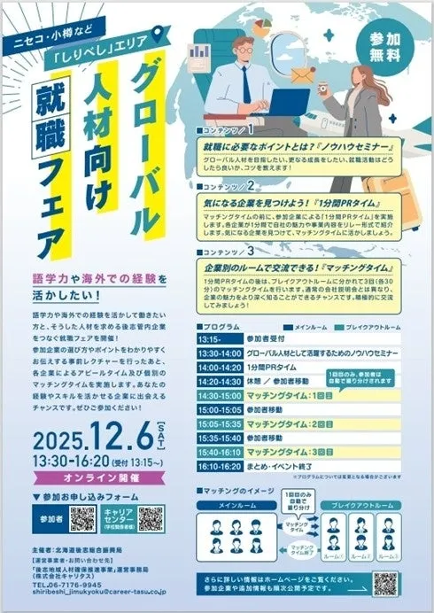 北海道後志総合振興局主催の「グローバル人材向け就職フェア」が2025年12月6日(土)にオンラインで開催されます。このイベントは、語学力を活かした新たなキャリアを開拓したいと考えている方々を対象としており、特にニセコや小樽といった後志エリアの企業との出会いを提供します。