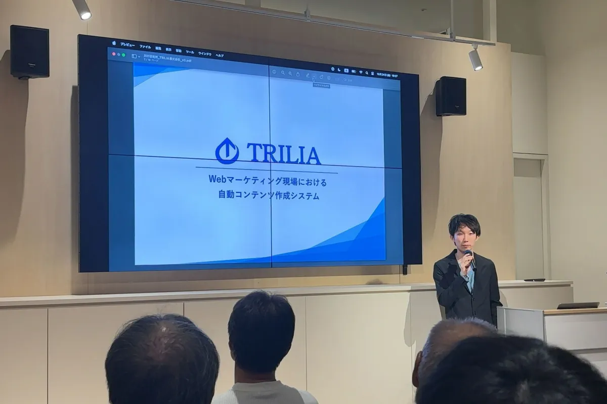 TRILIA株式会社のCTO、加藤祐基氏が北海道大学の川村研究所で行われた研究発表会に登壇し、AI技術を活用したWebマーケティングの事例を紹介しました。この発表は、地域におけるAIの活用が新たなビジネスを生み出す可能性を示すもので、参加者に新たな視点をもたらしました。