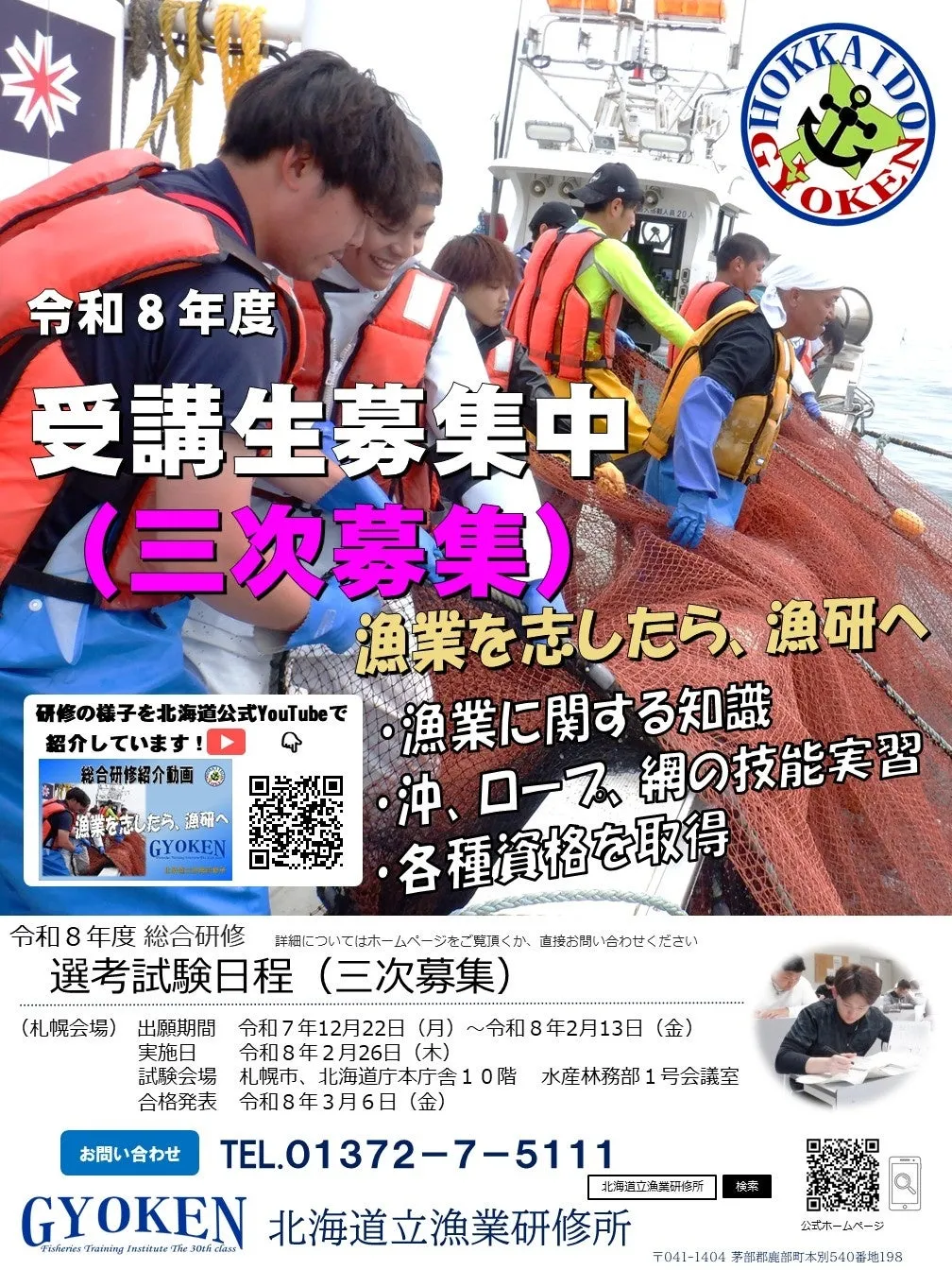 令和8年度の受講生三次募集が、北海道立漁業研修所で始まりました。この研修は、道内で漁業を担う次世代の人材を育成することを目的としています。特に漁業後継者や漁業に興味のある方々を広く対象とし、必要な知識と技術を身につけることができるよう配慮されています。