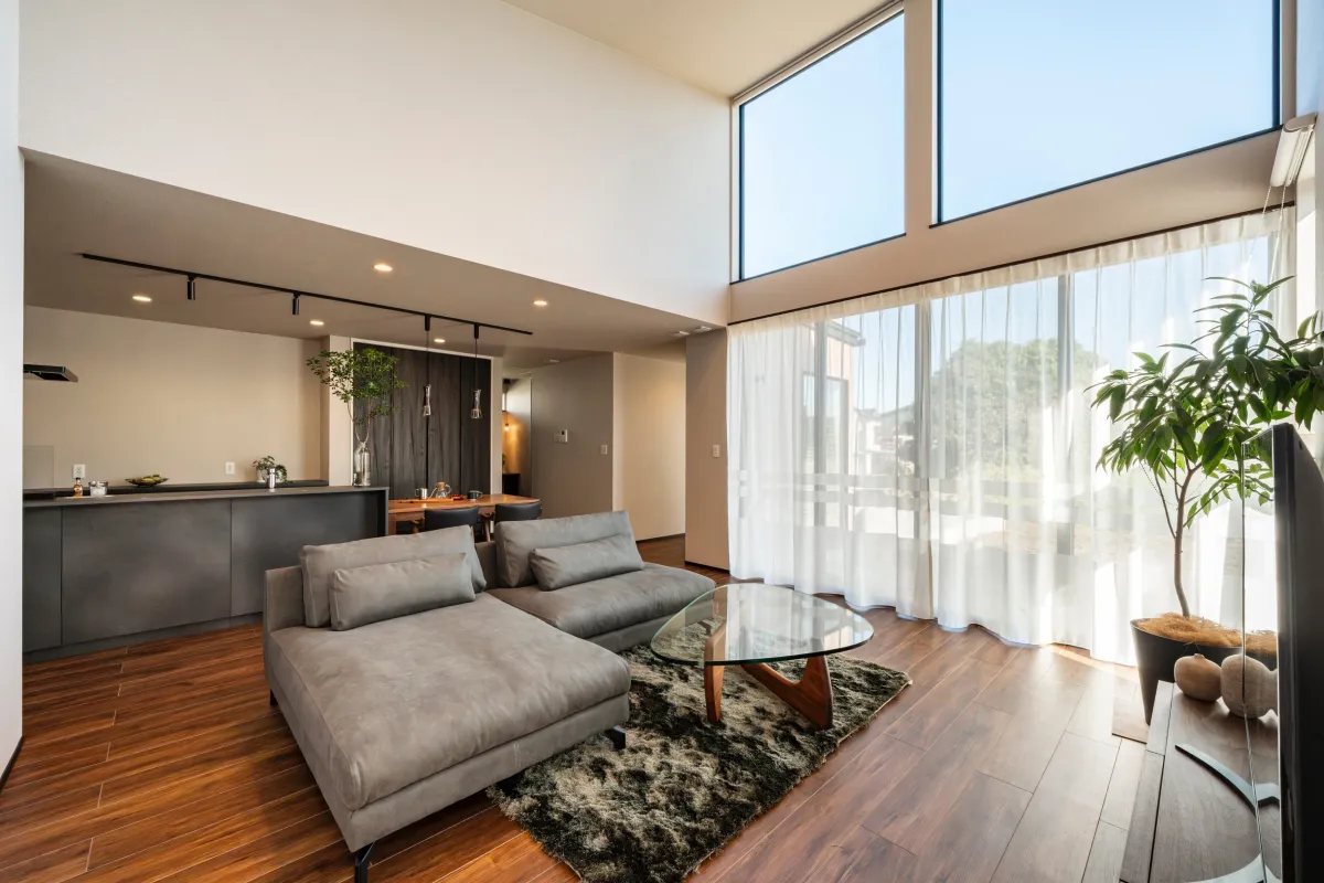 『はれまちモデル』の外観は、街のランドマークとなるべく設計されており、存在感があります。内部には、大開口のトリプルサッシから得られる豊かな光と、断熱性能を両立させたリビング空間があります。