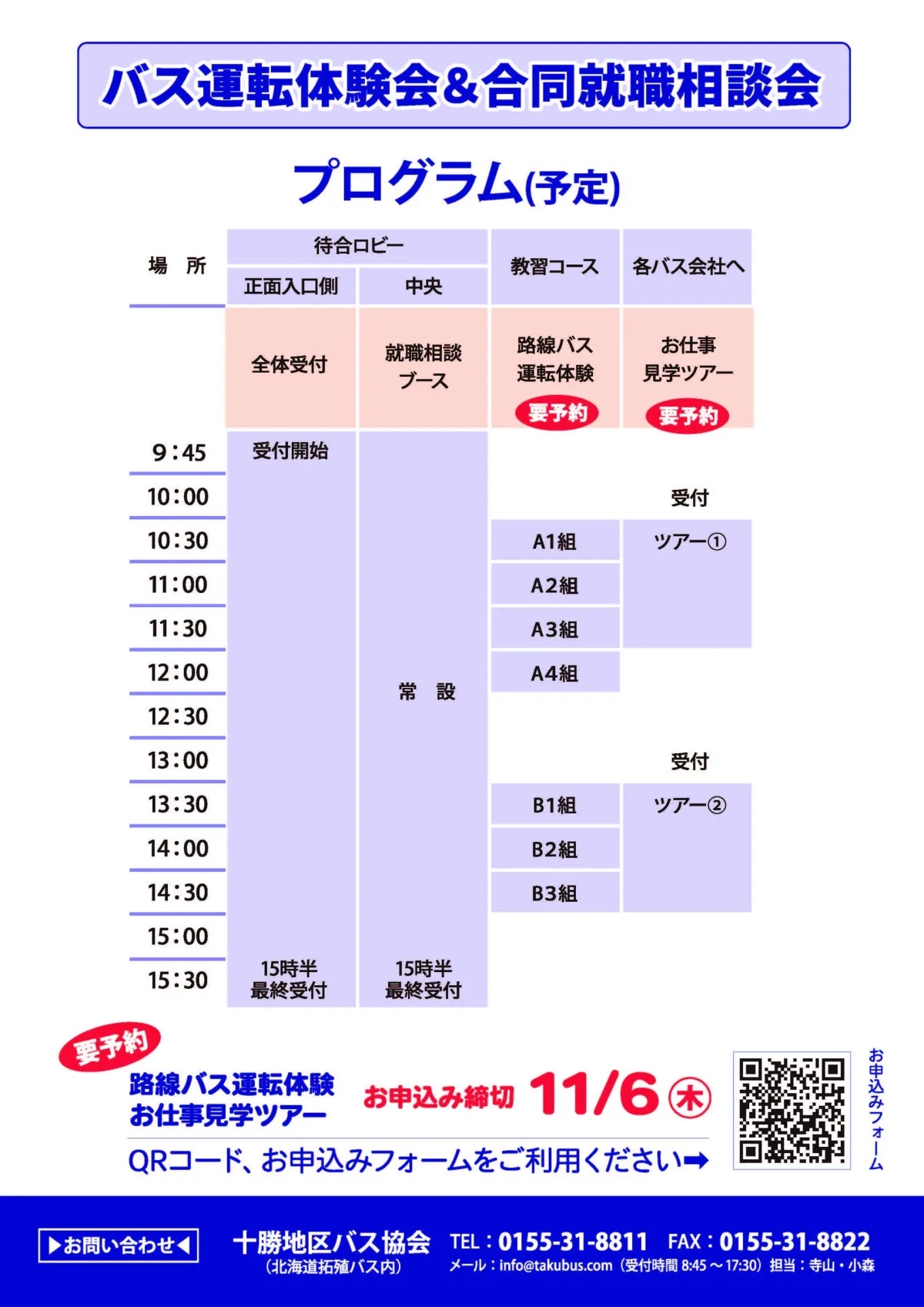 参加希望の方は、事前に予約が必要です。運転体験及び見学ツアーの予約は、以下のQRコードまたはURLから行えます。