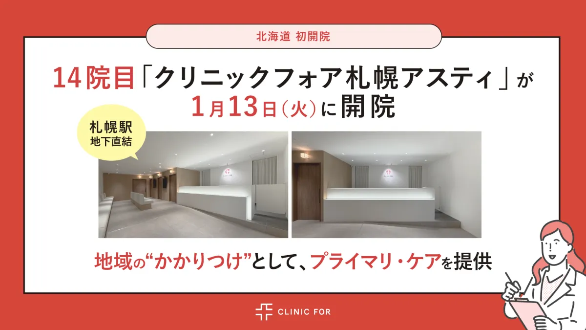 2026年1月13日(火)、札幌駅地下街に新たに開院した「クリニックフォア札幌アスティ」は、北海道におけるプライマリ・ケアの新たな拠点です。14院目となるこちらのクリニックは、対面診療とオンライン診療を同時に提供し、地域の医療ニーズに応えます。