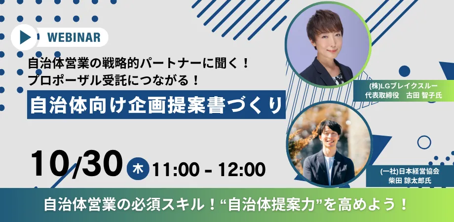 自治体営業は、多くの企業にとって新たなビジネスチャンスを生む重要な分野です。本セミナーを通じて、効果的な提案書作成の知識を得ることで、今後の営業活動に役立てていただきたく思います。是非ご参加ください!