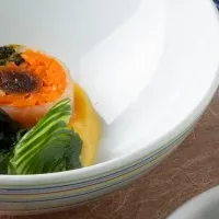 一口食べれば、バジルの清涼感がふわりと広がり、その後に続くトマトの酸味と甘み、生ハムの旨みと塩味が絶妙にマッチします。そして、クリームチーズソースのまろやかさが全体を包み込み、最後はじゃがいもといんげんの食感が加わることで、飽きが来ないように仕上げられています。さっぱりしつつも奥深い味わいが、夏の食欲をそそります。